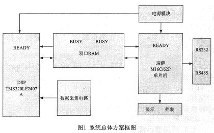 硬件平臺(tái)是軟件算法的運(yùn)行載體,是實(shí)現(xiàn)準(zhǔn)確、高效選線的保障。本文設(shè)計(jì)的選線裝置采用雙CPU。即"DSP+單片機(jī)"的處理機(jī)構(gòu)。DSP作為運(yùn)算CPU,負(fù)責(zé)信號(hào)采集、選線計(jì)算部分;單片機(jī)作為管理CPU,主要負(fù)責(zé)人機(jī)交互部分。DSP處理器由于內(nèi)部采用哈佛總線結(jié)構(gòu),指令是流水線操作,以及獨(dú)立的硬件乘法器結(jié)構(gòu)等,非常適合進(jìn)行數(shù)字信號(hào)處理,進(jìn)行實(shí)時(shí)的數(shù)據(jù)分析和監(jiān)控。本文采用TI公司的TMS320LF2407A(以下簡(jiǎn)稱LF2407A)DSP芯片為數(shù)據(jù)采集和處理CPU,充分利用其強(qiáng)大的數(shù)據(jù)處理能力和速度,實(shí)現(xiàn)多點(diǎn)數(shù)據(jù)采集和快速參數(shù)計(jì)算。單片機(jī)采用瑞薩M16C/62P系列單片機(jī),該單片機(jī)具有很強(qiáng)的抗干擾能力和1M的尋址空間,適用于事件管理和人機(jī)交互。系統(tǒng)總體方案如圖1所示。本保護(hù)裝置位于現(xiàn)場(chǎng),進(jìn)行數(shù)據(jù)采集和處理,并且與上位機(jī)之間進(jìn)行通信。保護(hù)裝置采用M16C/62P單片機(jī)為主CPU,負(fù)責(zé)系統(tǒng)顯示、控制和與上位機(jī)通信;采用TMS320LF2407ADSP為從CPU,負(fù)責(zé)數(shù)據(jù)采集和處理;DSP與單片機(jī)之間用雙端口RAM進(jìn)行通信。系統(tǒng)通過(guò)RS232和RS485與上位機(jī)通信。