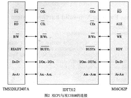 由于系統(tǒng)采用雙CPU,為了實(shí)現(xiàn)兩個(gè)CPU之間大量數(shù)據(jù)的快速交換,本裝置采用雙口RAM來(lái)實(shí)現(xiàn)兩CPU之間快速的數(shù)據(jù)交換。