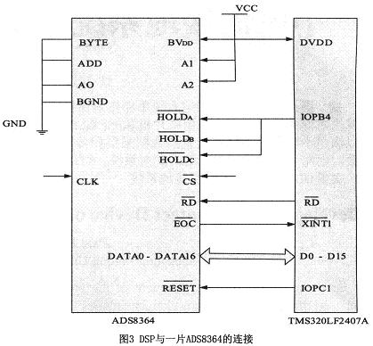 TMS320LF4207A本身雖然自帶A/D轉(zhuǎn)換器,但其轉(zhuǎn)換精度只有10位,且轉(zhuǎn)換速度也不高(500ns)。為了實(shí)現(xiàn)更高的速度和精度,選擇了擴(kuò)展ADS8364芯片。ADS8364是一種高速、低功耗、雙16bA/D轉(zhuǎn)換器,有6個(gè)模擬量輸入通道。可用BVDD獨(dú)立供電。它有6個(gè)完全相同的采樣保持電路,分成A、B、C3組,每一組都由1個(gè)HOLD引腳控制。ADS8364可以從外部引入最大5MHz的時(shí)鐘頻率,此時(shí)采樣時(shí)間是0.8μs,轉(zhuǎn)換時(shí)間只有3.2μs,A/D的最大采樣率達(dá)到250K,要達(dá)到此值,可在下一次轉(zhuǎn)換開(kāi)始時(shí)讀取上一次的轉(zhuǎn)換結(jié)果。此A/D完全可以滿足本裝置的采樣要求。AD芯片與DSP的連接如圖3所示。