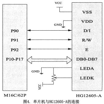 HG12605-A中內(nèi)藏ST7920點(diǎn)陣式LCD控制與驅(qū)動(dòng)芯片,可以顯示字母、數(shù)字符號(hào)、漢字、以及自定義文字符號(hào)。ST7920芯片內(nèi)部集RAM和ROM、字型產(chǎn)生器、以及液晶驅(qū)動(dòng)器和控制電路于一體,因此,只要一個(gè)很小的處理系統(tǒng),就可以操作HG12605-A液晶顯示模塊,并且硬件連接簡(jiǎn)單。液晶模塊和單片機(jī)的連接如圖4所示。