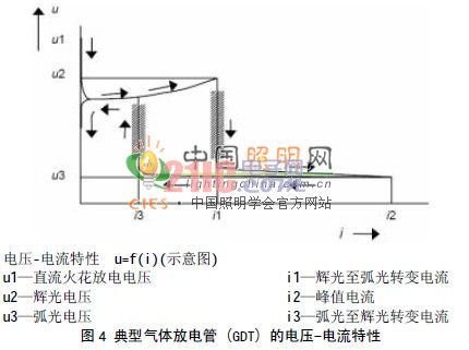 由于浪涌干擾所致,一旦加在氣體放電管兩端的電壓超過火花放電電壓(圖4的u1)時,放電管內部氣體被電離,放電管開始放電。放電管端的壓降迅速下降至輝光放電電壓(圖4的u2)(u2在表2中的數值為140V或180V,與管子本身的特性有關),管內電流開始升高。隨著放電電流的進一步增大,放電管便進入弧光放電狀態。在這種狀態下,管子兩端電壓(弧光電壓)跌得很低(圖4的u3)(u3在表2中數值為15V或20V,與管子本身的特性有關),且弧光電壓在相當寬的電流變動范圍(從圖4的i1→i2過程中)內保持穩定。因此,外界的高電壓浪涌干擾,由于氣體放電管的放電作用,被化解成了低電壓和大電流的受保護情況(u3和i2),且這個電流(從圖4的i2→i3)經由氣體放電管本身流回到干擾源里,免除了干擾對燈具可能帶來的危害。隨著浪涌過電壓的消退,流過氣體放電管的電流降到維持弧光放電狀態所需的最小值以下(約為10mA~100mA,與管子本身的特性關),弧光放電便停止,并再次通過輝光放電狀態后,結束整個放電狀態(熄?。?。