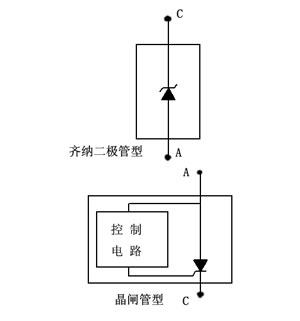 NUD4700是一種兩端器件,其外形如圖3所示,A端為陽(yáng)極,C端為陰極。其內(nèi)部結(jié)構(gòu)如圖2的下圖所示,它由控制電路及單向晶閘管組成。