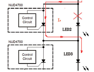 NUD4700的典型應(yīng)用電路如圖4所示。這是一個(gè)交流供電,往AC/DC轉(zhuǎn)換器輸出直流電壓,再由NUD4701恒流LED驅(qū)動(dòng)器驅(qū)動(dòng)5個(gè)串聯(lián)的1W大功率LED的電路。NUD4700與LED并聯(lián)連接在一起。在LED未開路時(shí),由于LED的正向降壓VF小于晶閘管的“開啟”電壓V(BR),則NUD4700為“關(guān)閉狀態(tài)”。在關(guān)閉狀態(tài)時(shí),只有小于250μA的漏電電流經(jīng)過(guò)NUD4700,相當(dāng)于NUD4700“開路”,不影響LED的工作。若串聯(lián)的LED中有一個(gè)(如LED2)因損壞而開路了,此時(shí)與LED2并聯(lián)的NUD4700的A、C之間電壓超過(guò)了“啟動(dòng)”電壓V(BR)(5.5~7.5V),NUD4700啟動(dòng),由關(guān)閉狀態(tài)轉(zhuǎn)為“導(dǎo)通狀態(tài)”。在導(dǎo)通狀態(tài)時(shí),A、C之間導(dǎo)通電壓VT為1.0~1.2V。此時(shí),LED的電流由LED1流經(jīng)NUD4700的A、C,再流入LED3,如圖5所示。5個(gè)LED的燈僅有4個(gè)LED工作,其亮度稍差一些,但仍可以正常工作,并且不影響其恒流的大小。