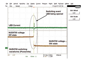 NUD4700的典型工作波形如圖6所示。圖6中,綠色是LED電流波形,棕色是NUD4700關(guān)閉狀態(tài)轉(zhuǎn)換到導(dǎo)通狀態(tài)的波形。橢圓內(nèi)是LED開路瞬間波形,此時(shí),LED電流IF經(jīng)一些波動(dòng)后恢復(fù)到原來(lái)電流;與此同時(shí),NUD4700由關(guān)閉狀態(tài)轉(zhuǎn)換到導(dǎo)通狀態(tài),其電壓由VF下降到1~1.2V,其響應(yīng)時(shí)間是很快的(dv/dt最小值為250V/μs)。