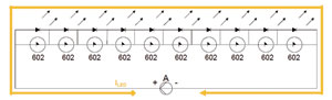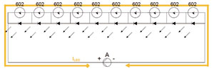 若LED串與驅(qū)動(dòng)器連接時(shí)極性接反,則有可能LED受反壓過(guò)大而損壞。由于SMD602內(nèi)部有反接二極管,在LED串極性接反時(shí),其內(nèi)部的二極管極性是正確的,則LED的電流經(jīng)SMD內(nèi)部的二極管形成回路,LED得到保護(hù),如圖10所示。