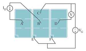 圖2顯示了測量的結構。3個MOSFET和6個探針均在圖中顯示出來,電接觸則示意性地畫出。中間的MOSFET是待測器件。