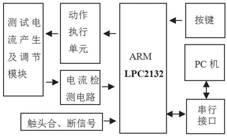 系統以LPC2132為核心,具有擴展測試電流的產生和調節模塊、動作執行單元、電流檢測電路以及鍵盤等外圍設備。LPC2132是一個支持實時仿真和跟蹤32位ARM7TDMI-S核的微控制器,1個10位8路A/D轉換器,2個32位定時器/計數器,6路PWM單元輸出,2個硬件I2C接口和47個GPIO,2個16C550工業標準UART,以及多達9個邊沿或電平觸發的外部中斷。16kB的片內靜態RAM和64kB的片內Flash程序存儲器避免了LPC2132外擴存儲器,簡化了電路,提高了運行速度。漏電保護器的動作特性自動測試系統結構框圖如圖1所示。