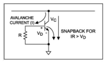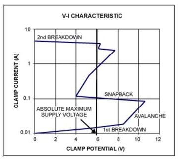 [page]箝位電壓從第一次擊穿變化到突變穩(wěn)定后的導(dǎo)通電壓,如圖5所示。為保證箝位時(shí)關(guān)閉正常的工作條件,設(shè)計(jì)的箝位電壓一般要略高于IC的絕對(duì)最大電壓。