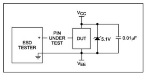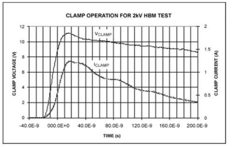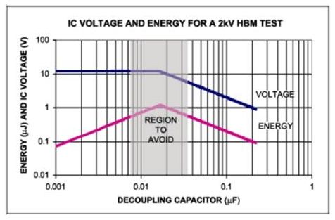 電源去耦電容會(huì)影響箝位操作,傳遞到去耦電容的電荷會(huì)產(chǎn)生高于IC絕對(duì)最大值的電壓,但還不足以使箝位電路導(dǎo)通。這時(shí)的電容相當(dāng)于一個(gè)能源,迅速向器件注入能量。