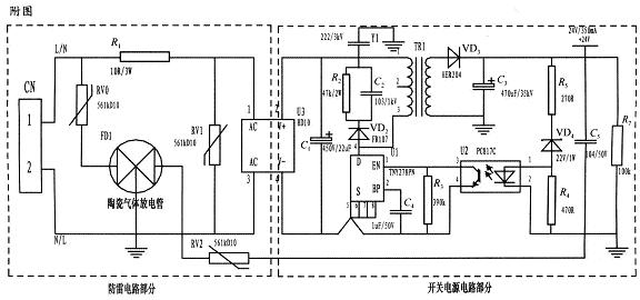為了實現上述目的所采取的設計方案是:將壓敏電阻和陶瓷氣體放電管的單相并聯式抗雷擊浪涌電路應用到儀表的電源上。主要分為防雷電路部分和開關電源電路部分,電路簡單,采用復合式對稱電路,共模、差摸全保護,可以不分L、N端連接。使壓敏電阻RV1位于貼片整流模塊前端分別與電源L、N并聯,主要來鉗位L、N線間電壓,壓敏電阻RV0、RV2與陶瓷氣體放電管FD1串聯后接地,RV0與FD1串聯主要是泄放L線上感應雷擊浪涌電流,RV2與FD1串聯主要是泄放由信號口串人24V參考電位上的能量,RV0、RV2短路失效后,FD1可將其與電源電路分離,不會導致失火現象。