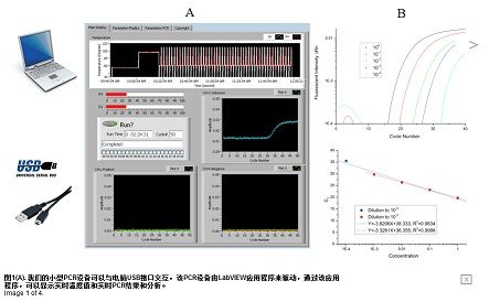 利用該系統(tǒng)同時運行包含預(yù)加載PCR反應(yīng)物的三個聚合物,從抽樣到結(jié)果所花費時間不到一小時,并且允許采用大量生物的多樣性。利用熱敏電阻的實時溫度反饋,一個內(nèi)部比例積分微分(PID)芯片來處理溫度控制。該控制器由一個補償器,輸出裝置和傳感器反饋信號組成,反饋信號對于控制加熱器輸出功率,以及保持溫度是很必要的。使用LabVIEW軟件,我們對圖形用戶接口進行編程,以顯示實時溫度,設(shè)置溫度,并且顯示來自三個通道的實時PCR結(jié)果 (如圖1A所示)。