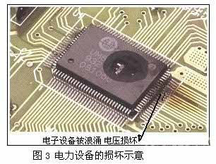 ⑵ 電力設備的損壞。干擾信號和浪涌對電路的不利影響是每一個電力工程師都不能忽視的問題。在過去繼電器的短時間過載輸入可能是沒有危險的,但是在使用半導體電路的時代里,即使是低能量脈沖也能造成損壞或操作失敗,其損壞見圖3所示。