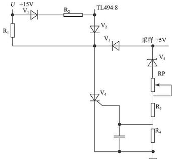 工作原理: 數控開關電源由輔助電源+ 15 V 提供給可控硅V4管陽極工作電壓, 實際輸出取樣電壓送至穩壓管V5 , 當超出保護電壓閾值+ 5. 5 V 時, 輸出電壓經穩壓管、電阻R3 、R4 分壓觸發可控硅V4 導通, 將輔助電源+ 15 V 通過電阻R1接地, 同時通過二極管V2切斷8 腳電源。調節RP 電位器, 可以對輸出電壓保護閾值點進行設置?! ?br />