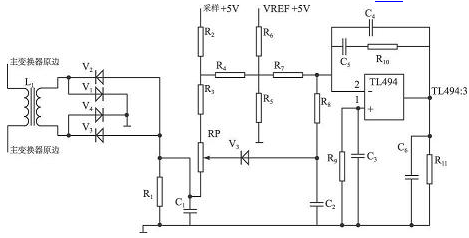 本開關電源過流保護電路的工作原理見圖4。變壓器T 1原邊串接在開關電源主變壓器原邊回路中, 通過實驗選擇合理的變壓器原副邊匝數比,感應開關電源變換時的原邊電流值, 經二極管V1 ~ V4 整流, R1、C1 濾波后送電位器RP。原邊電流越大,電流取樣變壓器整流出的電壓越大, 電位器RP 中心點電壓越低,TL494: 2 腳電壓隨之下降, 使得TL494: 3 腳電壓升高,送入脈寬調制器, 將T L494 驅動脈沖寬度逐漸減少, 從而得到過流保護的目的。圖中電容C4、C5、R10為TL494 誤差放大器的反饋元件, 使得放大電路穩定可靠。