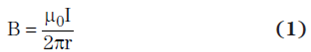 其中,B 為以第平方米伏秒 (V•s/m2) 表示的磁通密度,μ0 為自由空間中的磁導(dǎo)率(計(jì)算方法為 4π × 10–7 V•s/A•m),I 為以安培為單位的電流,r 為以米為單位的導(dǎo)體距離,而 H 為以安培每米 (A/m) 為單位的磁場(chǎng)強(qiáng)度。
