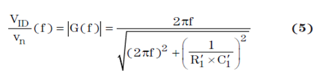 一次電路仿真證實(shí)了 RC 網(wǎng)絡(luò)為一個(gè)一階高通濾波器,其 C′1 和 R′1 為主要組件,頻率高達(dá) 100 MHz(參見圖 5 中藍(lán)色曲線)。超出這一頻率以后,寄生組件 C′2 和R′2生效,從而引起稍稍偏離于線性的斜率。因此,頻率達(dá)到 100 MHz 以后,增益響應(yīng)可以表示為 VID/vn 的比: