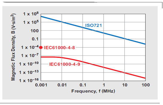 超出電容隔離器差動(dòng)電路噪聲預(yù)算的磁耦合要求 1MHz 下大于 11.7 V•s/m2(117千高斯) 的磁通量密度。這需要在一個(gè)距離器件 0.1m 的導(dǎo)體中有超過 5 百萬安的電流才能產(chǎn)生這樣一個(gè)磁場(chǎng)。在自然界或者任何制造設(shè)備中這都是不可能存在的。如果的確存在,那么設(shè)計(jì)人員便可做以下情況假設(shè):在隔離層失效以前,周圍的電路便都已失效。