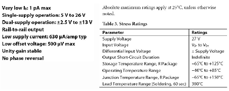 圖2顯示了AD8625(四通道)、AD8626(雙通道)和AD8627(單通道)運算放大器系列的"主要特性"和絕對最大值規格。這些放大器具有JFET輸入,采用+5 V單電源供電時,輸入共模電壓范圍為0 V至+3 V(最大值)。"無相位反轉"特性意味著:在+3 V至+5 V的共模區間,輸出不會發生相位反轉。