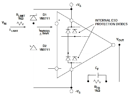 某些運算放大器,如OP27等,內置保護二極管,但仍然需要限流。如果運算放大器具有保護二極管,它通常會規定最大差分輸入電流。原理示意圖上也應顯示該保護電路。