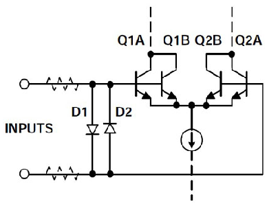 該電路適用于OP27等低噪聲運算放大器,也是許多其它采用低噪聲雙極性晶體管來構成差分對Q1-Q2的放大器的典型保護電路。如果沒有任何保護,可以看出,兩個輸入間高于大約7 V的電壓將導致Q2或Q1(取決于相對極性)反向結擊穿。注意,如果是射極-基極擊穿,則很小的反向電流也會導致兩個晶體管的增益和噪聲性能下降。發生射極-基極擊穿后,運算放大器參數(如偏置電流和噪聲等)可能會超出額定范圍。這通常是永久性的,逐漸而微妙地發生,特別是在由瞬變觸發的情況下。因此,幾乎所有低噪聲運算放大器,無論是基于NPN還是PNP,都會采用保護二極管,如輸入上的D1-D2等。如果施加的電壓超過±0.6 V,這些二極管就會導通,從而保護晶體管?! ?br />