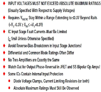 雖然可能存在一些例外,但務必注意:當發生超出電源軌0.3 V以上的過壓狀況時,多數IC運算放大器需要輸入保護?! ?br />