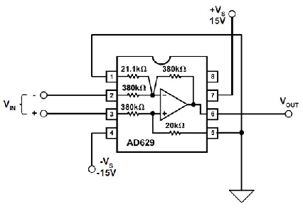 分析該拓撲結構可知,精密運算放大器AD629周圍的阻性網絡充當一個分壓器,將施加于VIN的共模電壓降低20倍。AD629同時以單位增益將輸入差模信號VIN轉換成以本地接地為基準的單端輸出信號。增益誤差不超過±0.03 %或±0.05 %,失調電壓不超過0.5 mV或1 mV(取決于器件等級)。AD629的電源電壓范圍是±2.5 V至±18 V.