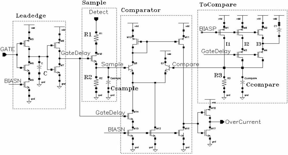 直接檢測(cè)漏端電壓判斷LDMOS 是否過流的設(shè)計(jì)思想是在LDMOS 管導(dǎo)通時(shí),通過采樣電路檢測(cè)LDMOS 漏端電壓,經(jīng)比較,過流比較器輸出一個(gè)低電平過流信號(hào)以關(guān)閉LDMOS 管;而在LDMOS 管截止期間,采樣電路不工作,同時(shí)為了提高可靠性將比較器窗口電平適度拉高。