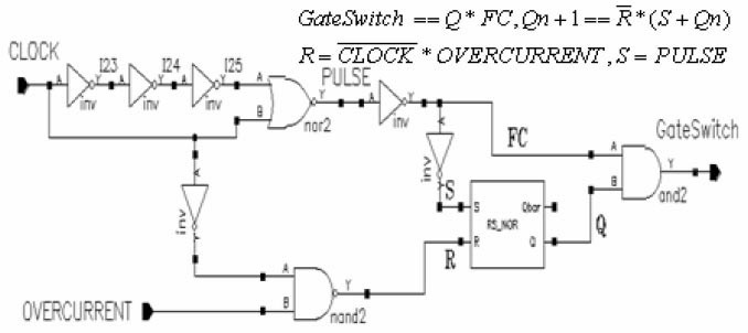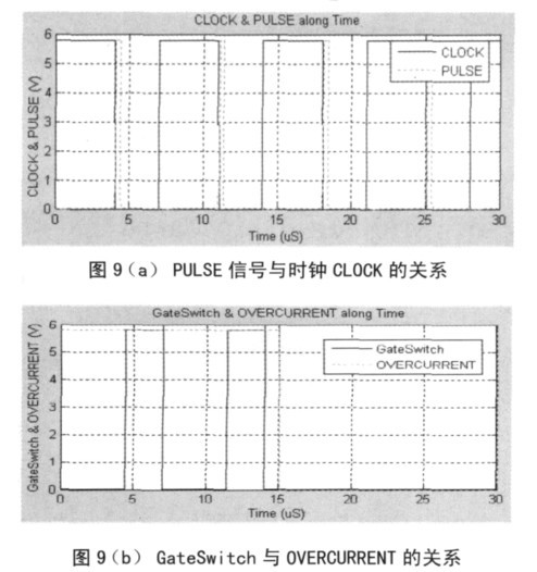 控制邏輯模塊如圖4 所示,該模塊直接控制LDMOS 的開關(guān)。PULSE 信號(hào)的上升沿對(duì)應(yīng)是CLOCK 時(shí)鐘的開始,PULSE 信號(hào)與時(shí)鐘CLOCK 的關(guān)系如圖9 所示。當(dāng)發(fā)生過流時(shí),OVERCURRENT信號(hào)為低,觸發(fā)器R 端為高,Q 為低,GateSwitch 信號(hào)為低,關(guān)斷LDMOS,從而實(shí)現(xiàn)過流保護(hù)功能。