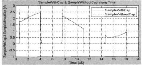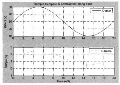 設(shè)檢測(cè)端電壓一般在10~50 V 之間變化,我們?cè)O(shè)置V(Detect)=SIN(30,20,50 k);周期為20μS;又設(shè)在采樣周期內(nèi),比較電壓為1 V;依據(jù)LDMOS管導(dǎo)通特性,設(shè)輸出漏電壓高于某值(本例為20伏)為過流,則分壓比設(shè)計(jì)為K = R4/ ( R3+R4)=5 k/(5 k+95 k)=1/20, 于是得到采樣電壓值為V(Sample)=V(Detect)*k =SIN(1.5,1,50 k),即最大值為2.5,最小值為0.5。同樣地,我們?cè)诓蓸与娐份敵龆思由弦粋€(gè)電容以消除電壓尖峰影響。該采樣電路仿真結(jié)果如圖6 所示。