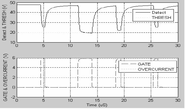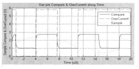 對(duì)圖3 進(jìn)行電路仿真,電源電壓VCC 為5.8 V,LDMOS 漏端檢測(cè)電壓在10~50 V 之間,柵端電壓脈沖頻率為132 kHz,占空比為60%的方波,SPICE仿真條件設(shè)置為VCC=5.8 V,V (Detect)= SIN(30,20,50k),V (Gate)=PULSE(0,5.8,0.5u,0.5u,0.5u,3u,7u),仿真結(jié)果如圖8 所示。在1.26 uS~4.17 uS 和8.25 uS~11.2 uS 這兩個(gè)采樣區(qū)間內(nèi),采樣電壓V(Sample)較比較電壓V(Compare)大,輸出為低電平(過流保護(hù),低電平有效);在15.2 uS~18.2 uS 采樣區(qū)間內(nèi),采樣電壓V (Sample) 較比較電壓V(Compare)小,輸出為高電平,對(duì)應(yīng)不發(fā)生過流情況;其他時(shí)間段內(nèi)柵電壓處于低電平,對(duì)應(yīng)LDMOS處于關(guān)斷態(tài),不可能發(fā)生過流,故過流輸出信號(hào)OverCurrent 為高電平。仿真結(jié)果表明,該電路確實(shí)能很好地實(shí)現(xiàn)過流保護(hù)的功能。