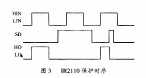 本設計逆變器為半橋式結構,串聯諧振負載,驅動采用IR公司的IR2110半橋驅動芯片。IR2110電路簡單,成本低,適用于中大功率IGBT,實驗結果也驗證了IR2110驅動中大功率IGBT的可行性。IR2110芯片有一個封鎖兩路驅動的SD輸入端,當此引腳為高電平時,立刻封鎖兩路輸出,如圖3所示。