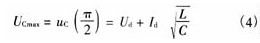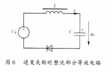 假設逆變關斷時濾波電感中的電流全部從電容C中流過,同時整流器繼續輸出電壓Ud。圖6給出了等效電路,L與C串聯諧振,由于整流橋電流只能單向流通,所以振蕩到T/4時結束。