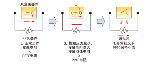 在正常狀態下,由于雙金屬片的電阻低,電流通過雙金屬片流過。在異常情況下,比如電動工具轉子堵轉時,電路中將產生很高的電流,導致雙金屬觸點打開,其接觸電阻增加。此時電流將通過低電阻的PPTC流過。流過PPTC的電流,不僅抑制了觸點之間電弧的產生,同時又加熱雙金屬片,使其保持在打開狀態和鎖定位置。