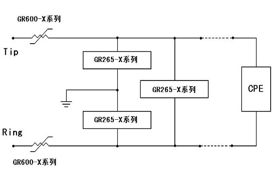 目前本公生產(chǎn)的GR265-X和GR600-X 等系列高分子PTC 熱敏電阻和半導(dǎo)體固體放電管一起用于總配線架的保安單元中,可以滿足過流和過壓保護(hù)的要求,同時幫助保安單元滿足中國通信行業(yè)標(biāo)準(zhǔn) YD/T 694-1999-2002、北美 TelcordiaGR-974 及 ITU-T K.20 等標(biāo)準(zhǔn),典型的使用電路如上圖所示。
