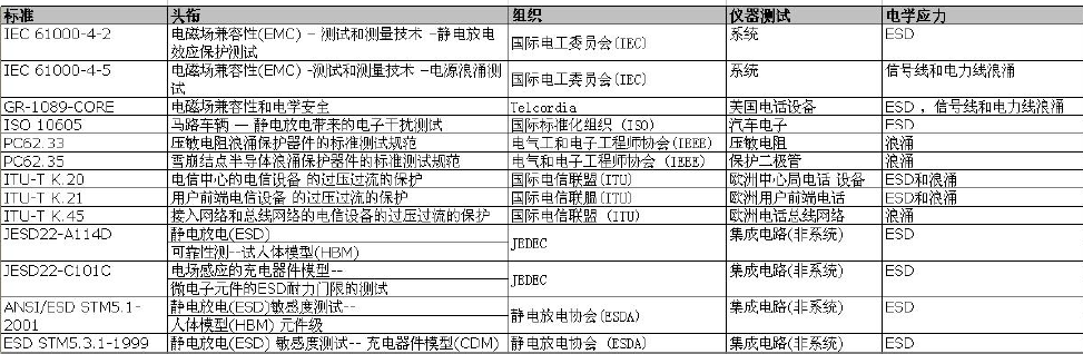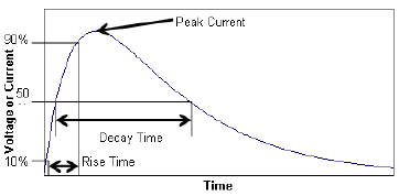 系統所經歷的電氣應力是各種各樣的: 有納秒上升時間且持續數以10計的安培電流的靜電放電(ESD)應力;有微秒上升時間且持續數以萬計的安培電流的閃電應力。對可以想到的現實世界中的每一種應力都進行產品測量是不可能的。所以標準機構制定了針對每個特定的應力威脅制定了專門的測試標準。這些標準以電壓和電流波形的形式來表示應力。最常見的一種應力波形就是圖示的雙指數波形。典型的電壓波型是被理解成開路,而典型的電流波型是被理解為短路。通常一個波形的參數包括峰值電壓、峰值電流、上升時間(通常是峰值時間的10%到90%)以及衰減時間(峰值時間的50%)。標準同樣規定了如何把應力波形應用到實際的被測試的設備以及通過或者未通過測試的準則。這就確保了測試結果可以被任何一個做此種測試的人重現出來,并且通過這個測試的系統可以可靠地工作。