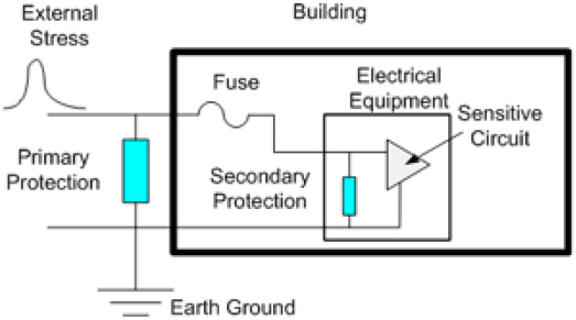 初級和次級保護的應用非常普遍。這個概念在電信產業中用于閃電和浪涌保護,也在先進集成電路技術中做靜電放電(ESD)保護。初級的保護元件較貼近應力源,主要目的是用于承受大部分的電流應力,而次級保護元件則非常貼近敏感的電路元件,在最需要的地方提供保護。