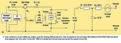最流行的HBM變種是國際電工委員會IEC1000-4-2標準,定義為150pF電容通過一個330Ω電阻放電(圖1b)。這是歐盟對在其區(qū)域內商品銷售所必須的國際測試。