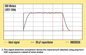 另外,許多新型消費電子器件能執(zhí)行快速的IEEE-1394/1394b(Fireware)數(shù)據(jù)轉換協(xié)議。這種非常高的數(shù)據(jù)速率(1600 Mbps,1394b)要求低電容ESD抑制器,例如聚合物浪涌器件(圖 2c)。測試數(shù)據(jù)表明,聚合物ESD抑制器帶來的信號失真比硅二極管器件保護Firewire端口產(chǎn)生的更少(圖 3)。