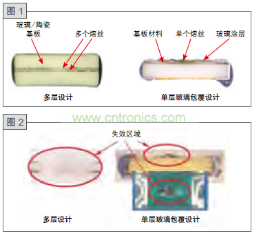 圖1比較了SFF保險絲的多層設(shè)計與標準玻璃包覆設(shè)計。當熔絲斷開時,玻璃包覆設(shè)計僅依靠熔絲一側(cè)上的涂層吸收汽化熔絲材