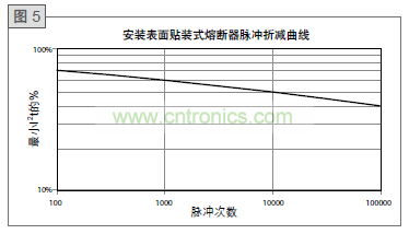一旦確定了應(yīng)用波形的I2t值,它必須根據(jù)系統(tǒng)壽命中的預(yù)期循環(huán)次數(shù)折減。由于電流脈沖導致的應(yīng)力本質(zhì)上是機械作用力,受力次數(shù)對保險絲折減程度具有重要影響。圖5給出了TE Connectivity表面貼裝式保險絲在十萬次循環(huán)內(nèi)的電流脈沖折減曲線。