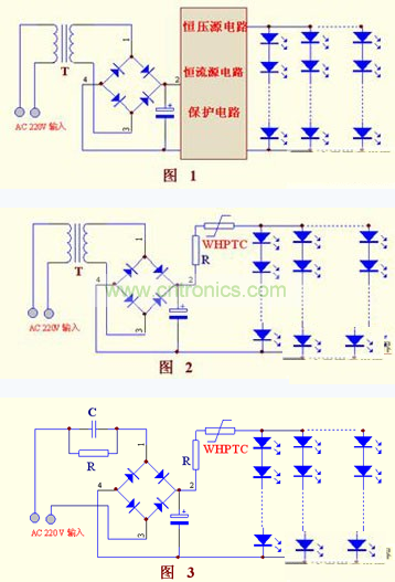 如果用WHPTC過流保護器作保護,將是另外一種結果,從原理可知,當電路的電流超過規定值時會訊速的自動保護,在排除故障后又自動復位,無需人工更換。對LED而言,電壓的變化不是LED損壞的直接原因,而電流的增大才是LED的真正殺手。顯而易見,利用WHPTC的這個特性,在LED的電路保護上具有絕對的優勢,讓簡易電源供電變為現實。實踐證明,在LED電路出現故障以前就有效保護了。在簡易電源上,這個優勢特別突出。對如下3圖分析可見,因有了WHPTC后可省去恒流、恒壓電路, LED的質量也提高了。器件成本、生產成本、故障率、服務成本等,都大大降低。也大大增加了產品的市場競爭力。所以誰先使用WHPTC,誰先占領市場。
