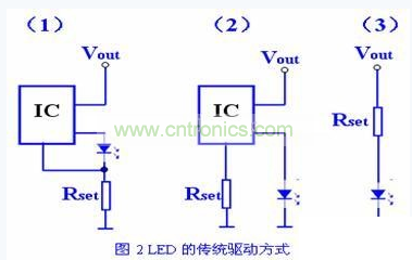 圖2中電路1為常用的驅動電路。其恒流源包括一條反饋回路。當調節電阻兩端的反饋電壓達到因IC而異的VFB時,LED電流就不變了。LED電流因而被穩定在ILED=VFB/Rout。