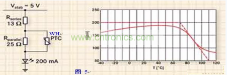 由于LED電流的絕大部分流經PTC熱敏電阻本身,因此需要選擇一個較大的徑向引線式元件。PTC將因為流經電阻本身的電流而導致發熱,因此會一直減少電流,無論環境溫度為何(如圖5所示)。并聯兩個或更多片式PTC熱敏電阻會將電流分流,但此方案仍存在局限性。