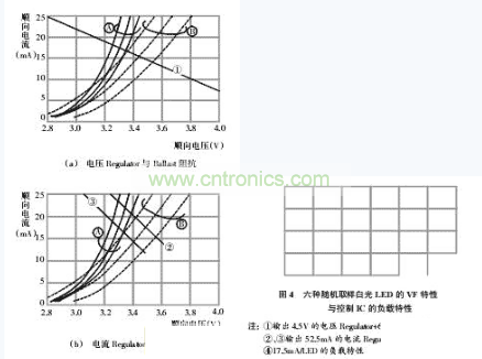 圖3是驅動白光LED常用的四種電源電路;圖4是上述六種隨機取樣白光LED穩定后的ReguLation精度特性。