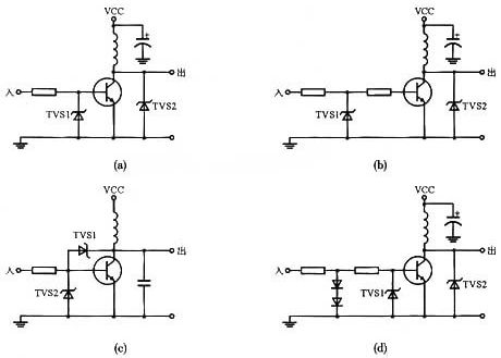 各種瞬變電壓能使晶體管的EB結(jié)或CE結(jié)擊穿而損壞,特別是晶體管集電極有感性(線圈、變壓器、電動(dòng)機(jī))負(fù)載時(shí),通常會(huì)產(chǎn)生高壓反電勢(shì),因而可能使晶體管損壞。在實(shí)際應(yīng)用中,建議采用TVS作為保護(hù)器件。圖3所示為T(mén)VS保護(hù)晶體管的四種電路實(shí)例。