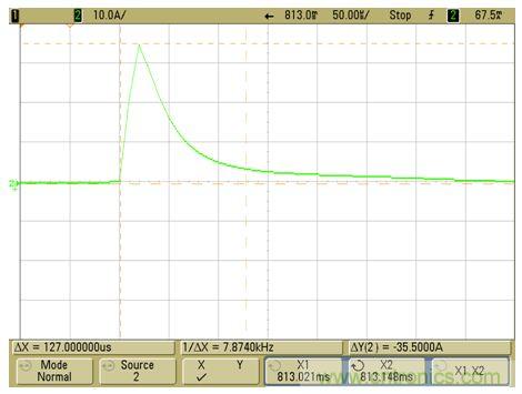 以下為實(shí)際應(yīng)用時(shí)量測(cè)到電源正常工作時(shí)的波形:電流尖峰 max 3.6A,寬度約為1.2ms;正常電流約為0.03A,正常工作時(shí)溫度可以達(dá)到85℃。