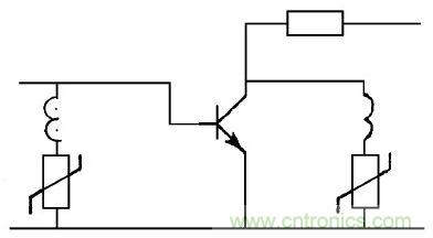圖11在晶體管電路中, 三極管的e 極和b 極間, c級與b 級間帶有感性的負載兩端, 都可以并聯壓敏電阻; e 極與c 極接上壓敏電阻器, 能防止輸入過電壓雷擊損壞晶體管。當所控制的負載屬感性的變壓器、鎮流器、電感、逆變器等, 在c 級與b 極間或者在負載線圈兩端并接壓敏電阻, 能有效地抑制電壓對晶體管的損傷。當電路正常工作時, 壓敏電阻處于高阻抗狀態, 而電路中產生過電壓時, 壓敏電阻在毫微秒內導通, 限制過電壓的幅度, 使晶體管免受損壞。