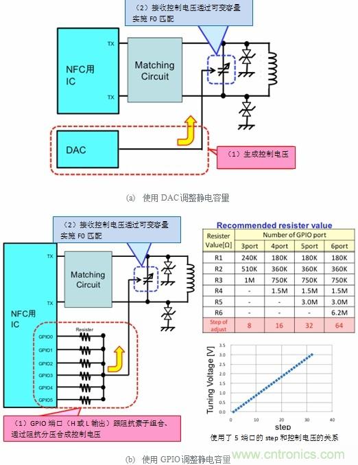 第二, 如圖2(b)所示,從NFC用IC等GPIO端口生成控制電壓來調(diào)整靜電容量。GPIO是General Purpose Input/Output的簡稱,是IC芯片提供的輸出端子的一種。特定用途和信號尚未明確,但可以根據(jù)軟件指令進(jìn)行任意的輸出變化。比如說,軟件指示為輸入“0”的話則為0V,指示為輸入“1”的話則有可能會(huì)執(zhí)行輸出3V的操作。如果利用GPIO的輸出端子的話,如果收到的是0V、3V這兩個(gè)值的輸出信號,那么執(zhí)行的操作就是通過2n的電子元件的組合來實(shí)現(xiàn)合成2n的阻抗電壓。