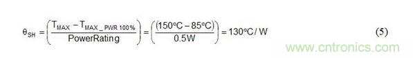 另外,電阻器也不可能在 100% 額定耗散 (TMAX_PWR100%)、85°C 下工作。您可通過該溫度、最大工作溫度以及電阻器的功率額定值計(jì)算出針對 θSH 的值,如圖 5 所示。