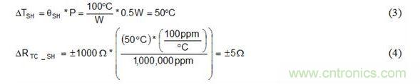 公式 3 可計(jì)算功率耗散所引起的電阻器溫度增加量 ΔTSH。公式 4 將 ΔTSH 插入公式 1 替代 ΔT,以確定 100°C/W 適度自發(fā)熱和 0.5W 功率耗散情況下自發(fā)熱所引起的電阻變化。
